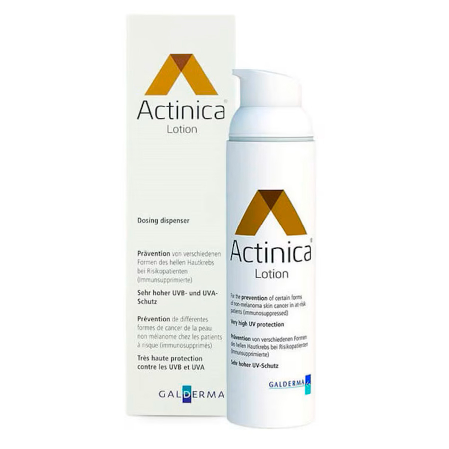 Actinica Lotion oferӑ protecție UVB și UVA foarte ridicată, datorită filtrelor fotostabile cu spectru larg pe care le conține (SPF 50+, PPD 26), având proprietăți de hidratare, care îmbunătățesc textura pielii. Are un dispozitiv de dozare inovator, care permite aplicarea unei cantități adecvate a loțiunii pe piele. Oferӑ tolerabilitate optimӑ, fară potențial alergic sau iritant, nu conține parfum şi poate fi utilizatӑ pe tot parcursul anului.