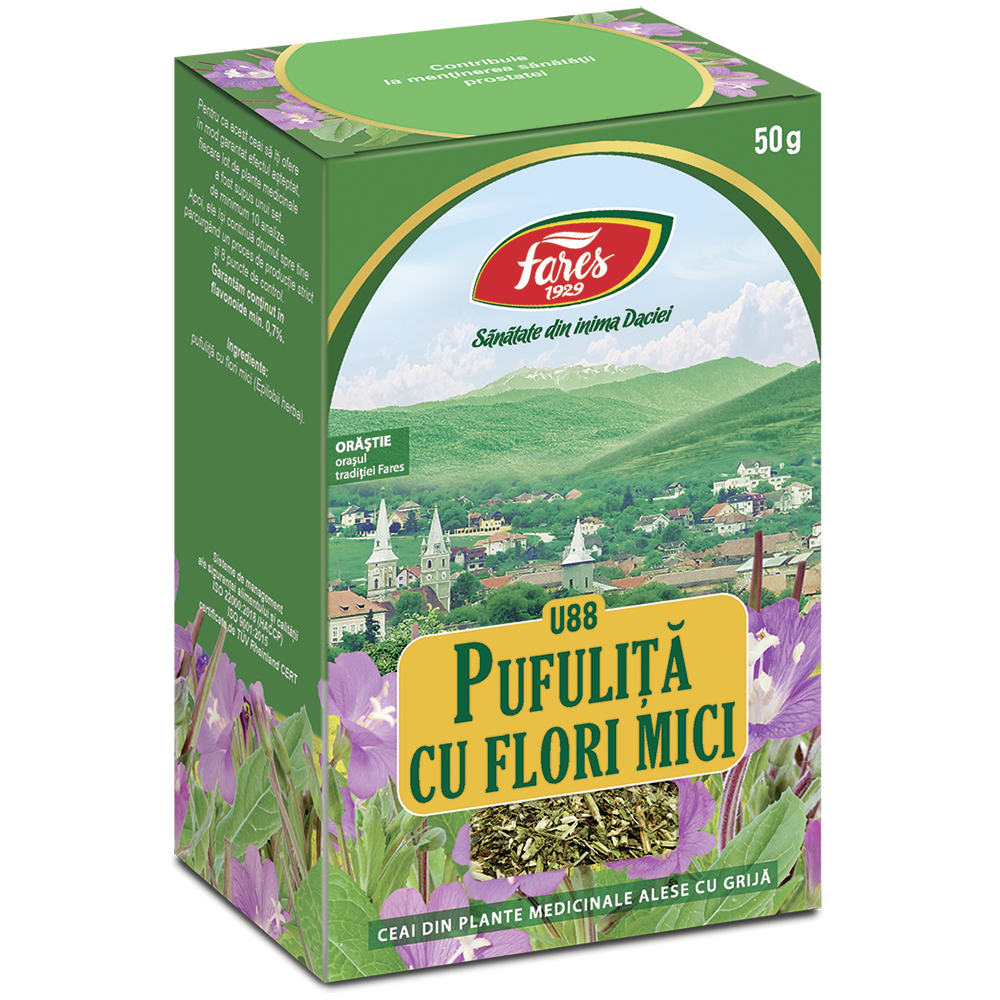 Partea superioară a plantei pufuliţӑ cu flori mici Epilobium spp., fam. Onagraceae, care conţine flavone, tanin, compuşi fenilpropanici, antociani, ulei esenţial, aminoacizi esenţiali, vitamina C, săruri minerale.