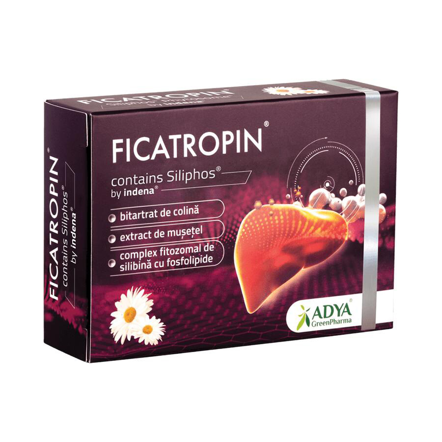 Ficatropin este un supliment alimentar marca Adya Green Pharma care vine în susținerea funcțiilor hepatice și buna funcționare a ficatului, cu o compoziție complexă și o combinație inedită de ingrediente active, printre care și brevetul Siliphos Phytosome al celor de la Indena S.p.A., compus inovator care asigură o biodisponibilitate superioară față de produsele clasice cu silimarină/silibinină.