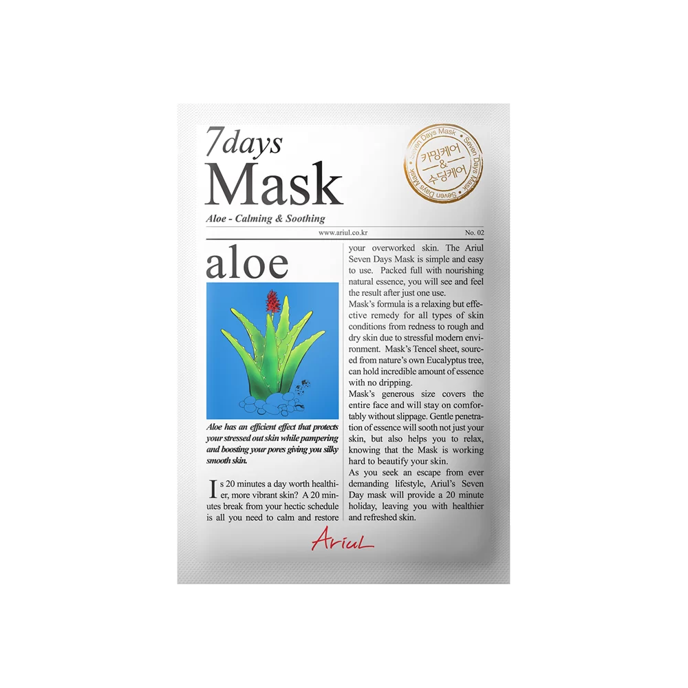 Cel mai popular produs Ariul, 7Days Mask, in varianta cu Aloe, calmeaza si relaxeaza pielea sensibila. Aloe confera un efect benefic de protectie a pielii suspusa stresului cotidian ingrijind-o si conferindu-i un aspect fin si matasos. Imbogatita cu o esenta naturala hranitoare, are rezultat vizibil imediat dupa prima utilizare. Formula mastii 7Days Mask Aloe este un remediu relaxant dar eficient pentru toate tipurile de probleme ale pielii cauzate de stilul de viata modern. De la roseata pana la lipsa de hidratare. Evadeaza 20 de minute din cotidian pentru un ten sanatos si reimprospatat.