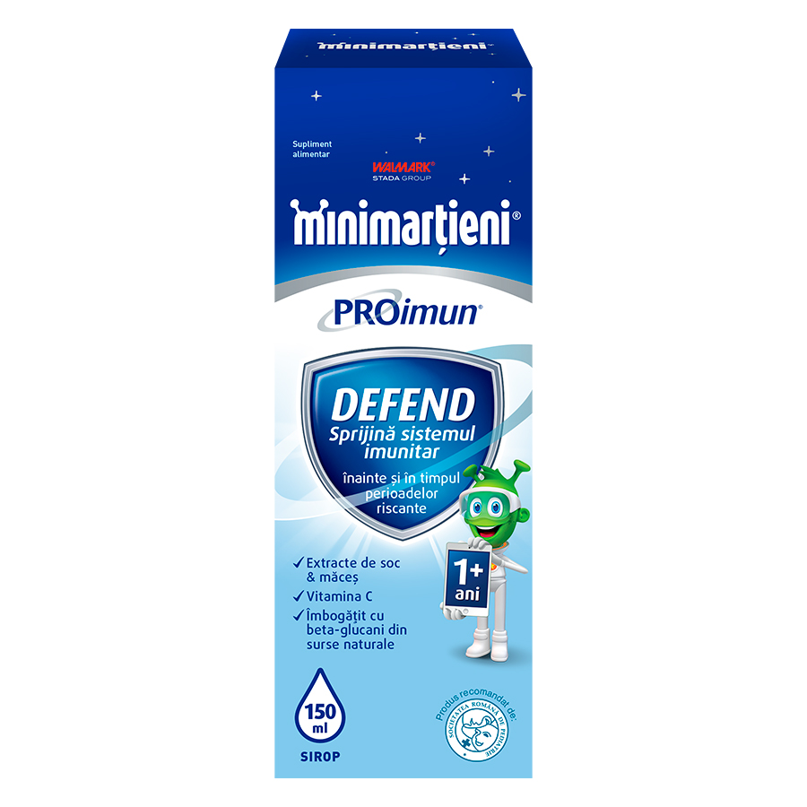 Minimarțieni PROimun Defend este un supliment alimentar sub formă de sirop, cu aromă de lămâie, care contribuie la buna funcționare a sistemului imunitar. Prin conținutul de substanțe active, soc, măceșe, drojdie, susține sănătatea sistemului imunitar, are efecte antioxidante și contribuie la menținerea sănătății tractului respirator.