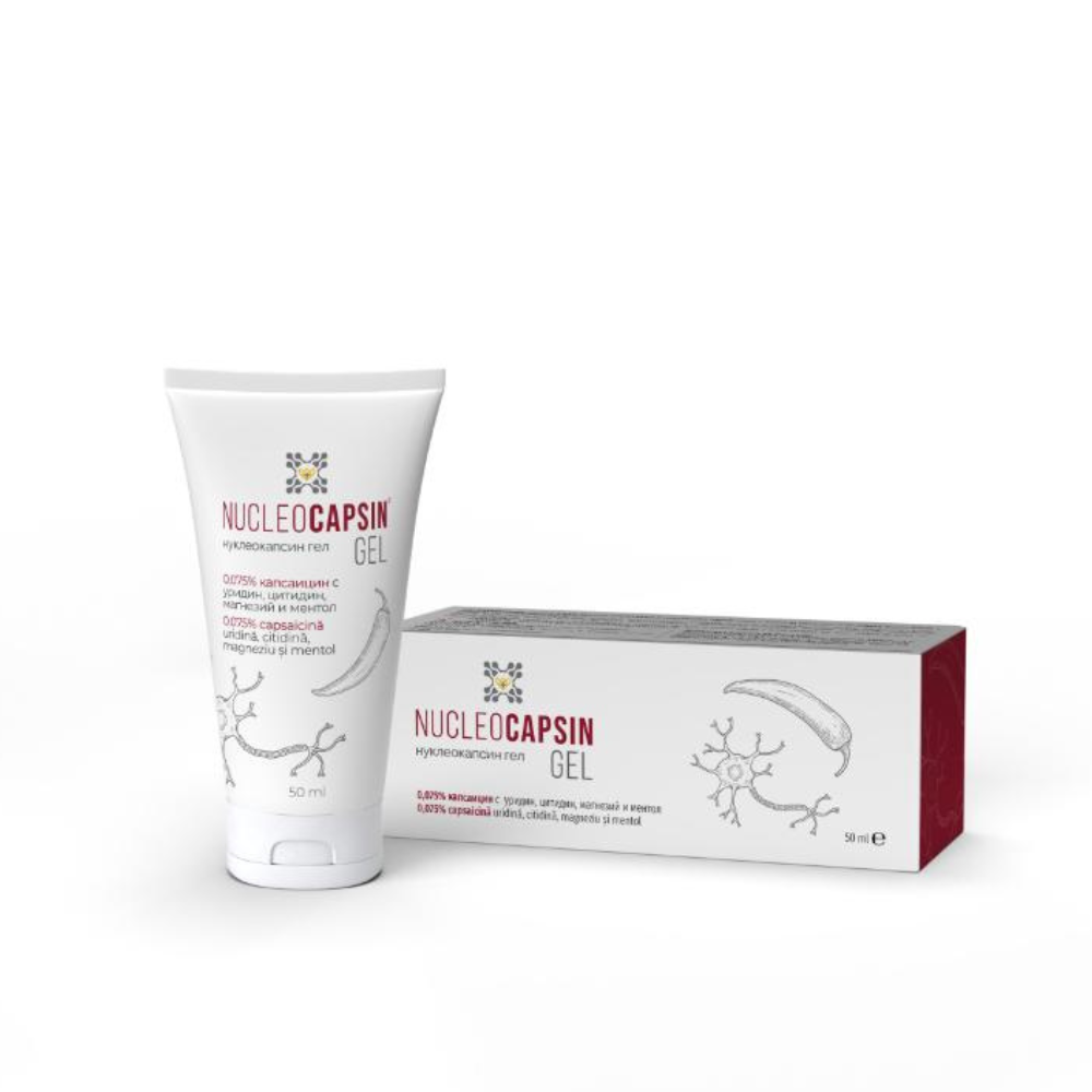 Nucleocapsin gel are efect de calmare si hidratare asupra pielii. Gelul este usor de aplicat si nu lasa urme grase ci o senzatie catifelata avand un miros placut si discret. Formula este compusa din capsaicina, uridina, citidina, magneziu si mentol.