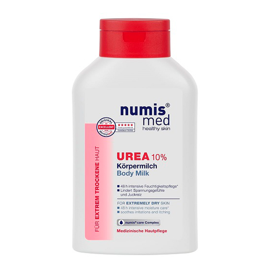 Numis® med UREA 10% Lapte de corp ingrijire speciala pentru pielea extrem de uscata, mancarime si descuamata. Formula bogată și eficientă cu uree și complexul de ingrediente active numis® care adaugă și reține intens hidratarea – până la 48 de ore*. Calmează și întărește bariera protectoare a pielii. Etanșeitatea este ameliorată imediat și pielea este protejată de uscare. Pentru o piele netedă, relaxată. Poate fi folosit și pentru a susține tratamentul eczemei ​​atopice și psoriazisului.*după utilizarea zilnică timp de 14 zile.Tolerabilitate excelentă – eficacitate testată dermatologic.Ingredientul activ ureea este capabil să absoarbă apa, să o lege și să o elibereze încet din nou. În acest fel, se asigură că pielea este mai bine hidratată și își reglează conținutul de umiditate.