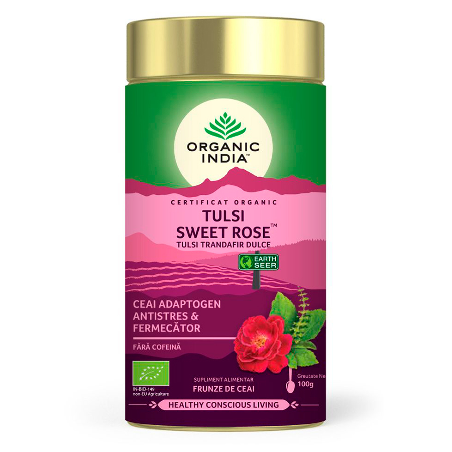 ORGANIC INDIA Ceai Tulsi (Busuioc Sfant) Trandafir Dulce, Antistres & Fermecator, un amestec delicat de Tulsi, fin echilibrat cu musetel linistitor, petale de trandafir si esenta naturala, organica si aromata a trandafirilor este o combinatie reconfortanta si exotica care evoca misterele Indiei.