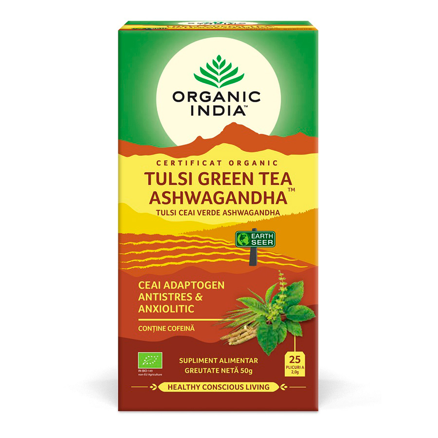 Organic India Ceai Tulsi Ashwagandha si Ceai Verde, Adaptogen & Anxiolitic, 25 plicuri, BIO, Innovoris Labs