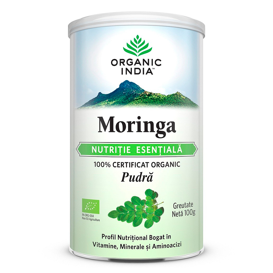 ORGANIC INDIA Moringa, Nutritie Esentiala este recomandata atletilor, culturistilor, sportivilor, mamelor insarcinate sau care alapteaza, copiilor in crestere si persoanelor bolnave cronic. Se amesteca excelent in smoothie si shake.