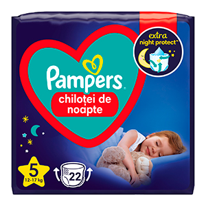 Scutecele-Chiloțel de noapte Pampers Night oferă o protecție mai bună pe timpul nopții, pentru un somn liniștit datorită unui nucleu intensificat care absoarbe instantaneu umezeala, asigurând până la 12 ore de protecție împotriva umezelii.
