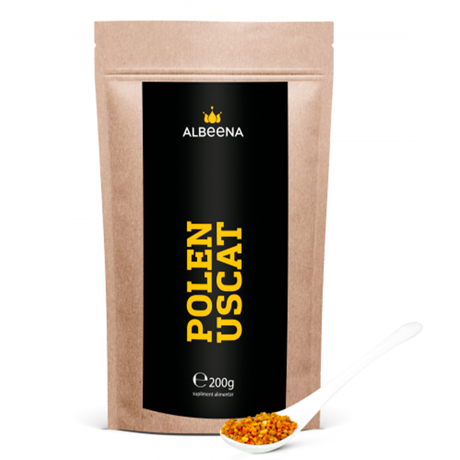 100% polen uscat la temperatura controlata, in uscatoare speciale care asigura pastrarea enzimelor si a nutrientilor esentiali. Disponibil in pungi etanse de 100g si 200g.
