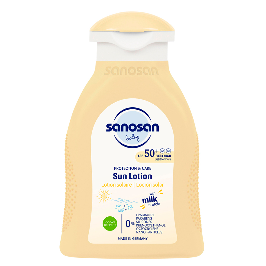 Sanosan Sun lotiune SPF 50+Textura placuta, repede absorbita de piele, nu lasa urme albe si nu e lipicioasa. Nivel de protectie ridicat/ Special echilibrata cu spectru de filtrare larg UVA +UVB cu SPF 50+/ Nivel de protectie ridicat chiar si pentru bebelusii cu pielea sensibila/Pielea ramane protejata dupa doua bai de 20 min fiecare/Ingrijire deosebita pentru piele. Cu ingrediente pretioase pentru epiderma precum extractul de ulei de masline din cultura organica., proteina de lapte , pantenol si vitamina E hidrateaza pielea si o protejaza de deshidratare. Nivel ridicat de siguranta/. Testata dermatologic sub indrmarea atenta a dermatologilor si pediatrilor.0% arome, parabeni, siliconi, fenoxitanol, octocrilen, nanoparticule. Protejeaza-ti nou nascutul sau copilul de razele soarelui intens si evita soarele arzator al amiezei. Foloseste un strat generous de Lotiune ecran cu factor de protectie 50+si lasa sa se absoarbe deplin inainte de a il expune pe cel mic la soare.Pentru copii mai mici de sase luni consultati medicul specialist inainte de a merge la plaja.Ingrediente:VEZI INGREDIENTS-IMPORTATOR-STABIL INTERCOM-AV.TEODOR ILIESCU NR.17/ 0728875948. A SE FOLOSI PREFERABIL INAINTE DE: VEZI AMBALAJ Aqua (Apa); Benzoat de alchil C12-15; Benzoat de dietilamino hidroxibenzoil hexil; Glicerină; Palmitat de izopropil: salicilat de etilhexil; Etilhexil triazonă; Alcool cetearilic; Cetil fosfat de potasiu; Bis-etilhexiloxifenol Metoxifenil triazină; Pantenol; tocoferol; Hidrolizat Protein Lapte Extract de fructe Olea Europaea (Olea Europaea (Olive) Fruit Extract); Dietilhexil butamido triazonă; Stearat de gliceril; Gumă Xanthan; Poligliceril-2 Dipolihidroxistearat; Gumă de salcâm Senegal; Acid asparticCaprylhidroxamic; Benzoat de sodiu; Aminometil propanol; Iminodisuccinat tetrasodic; Acid citric; Acid fumaric; Acid maleic; Acid malicPrietenoasa cu mediul natural .Testat clinic.