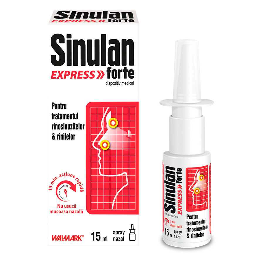 Sinulan Express Forte este un produs vâscos decongestionant care conține o soluție hipertonică pentru tratarea simptomelor de rinosinuzite și rinite de diferite origini. Sinulan Express Forțe formează o peliculă peste mucoasă nazală. Pelicula activă osmotic atrage instantaneu lichidul hipotonic prezent în părțile profunde ale mucoasei și creează un curent de fluid hipotonic din interior spre exterior. Acest efect mecanic deblochează și curăță toți contaminanții prezenți în cavitatea nazală și decongestionează pasajul nazal. Prin curățarea biofilmului blocant al sinusurilor deschide sinusurile, reducând presiunea și durerea. Pelicula formată de Sinulan Express Forțe protejează de asemenea suprafață nazală de uscăciune, iritare și agresiuni externe. Compoziția produsului ajută la îmbunătățirea respirației într-o perioadă foarte scurtă de timp.